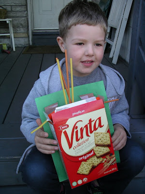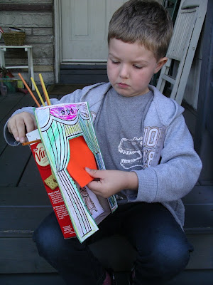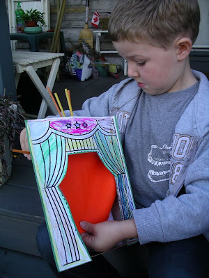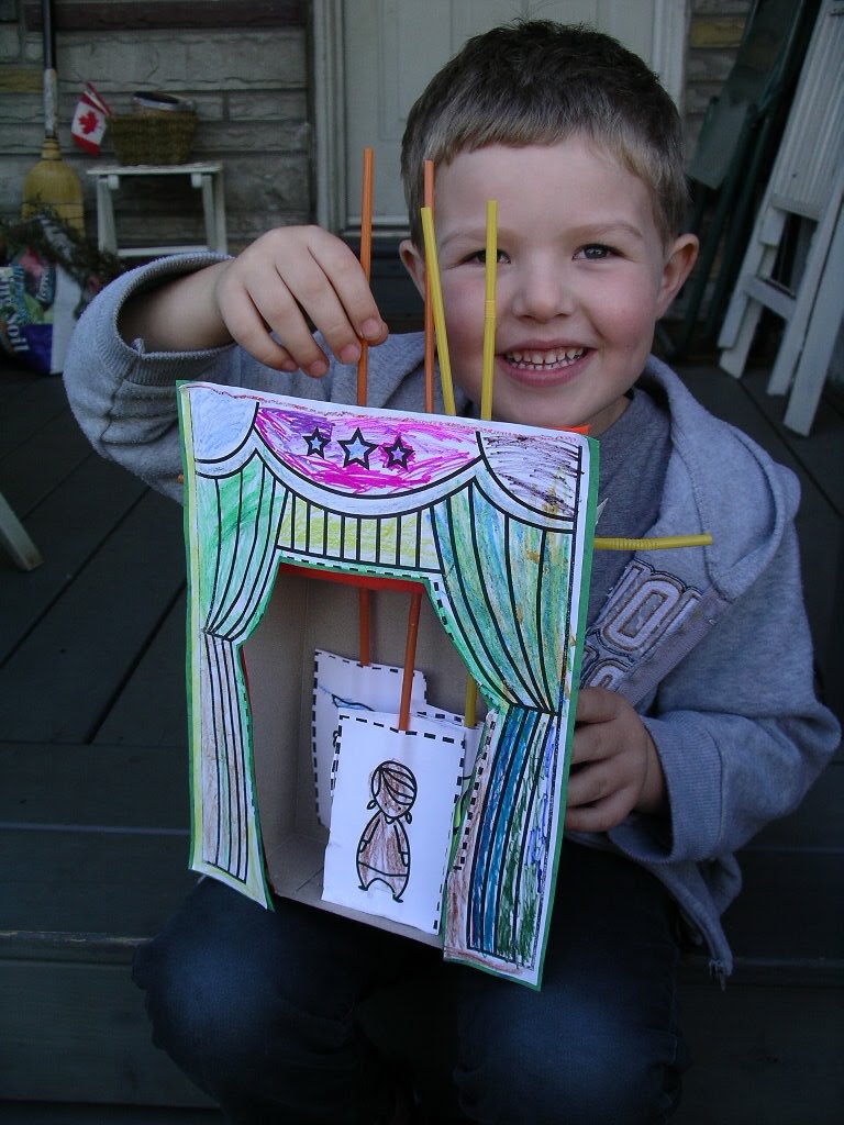 If you have a child who likes crafts and puppets, here's a cheap and cheerful weekend activity. Go to Craft Projects and print off the puppet theatre and puppet templates. Cut out an appropriate-size hole in a cracker box. Colour and cut out templates. Glue puppet theatre template to cracker box and attach puppets to straws or wooden sticks. We had to tape two straws together so that the puppets would reach down low enough. Voila!