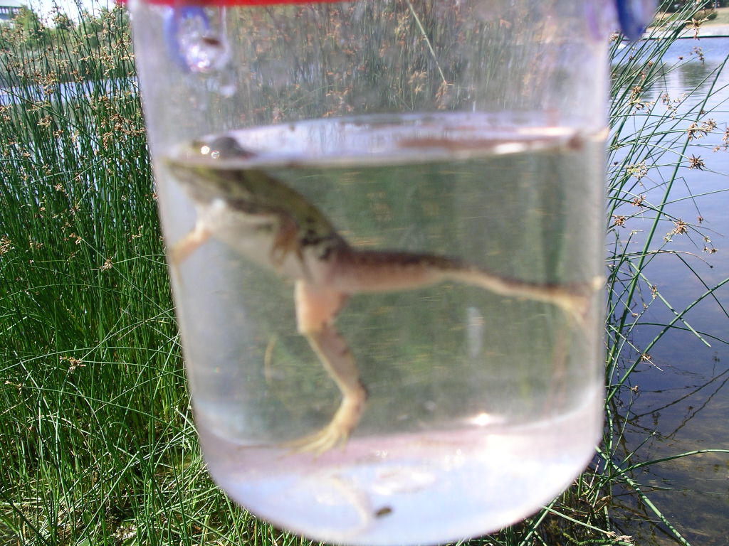 Over on the far side of the manmade pond, we caught a beautiful, green leopard frog.
