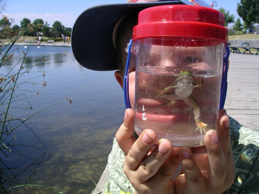 Today we went back to Woodbine Park, at the foot of Coxwell Avenue, before you get to Lake Ontario. We caught two froglets. The smaller one had already grown it's front legs, but the bigger one was barely out of the tadpole stage.